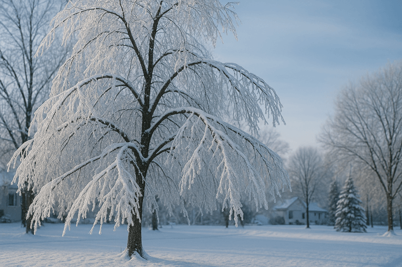 Dense evergreens and multi-stemmed ornamentals trap snow in their crowns. Deciduous trees with poor pruning history or large, overextended limbs also face higher risk when ice coats every twig.